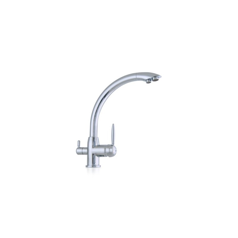 Rubinetto a 3 vie con beccuccio curvo per impianti di osmosi inversa e microfiltrazione. Corpo in ottone cromato, facile da installare, design moderno. Pratico, elegante, pronto da installare.